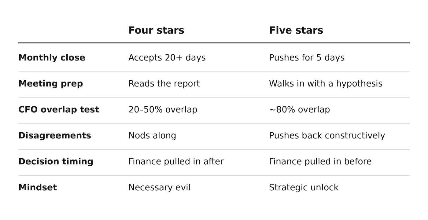 At five stars, you’re also having constructive disagreements with your CFO — not just nodding along. You’re pushing back when something doesn’t look right, because you already have a view on what the numbers should be saying.